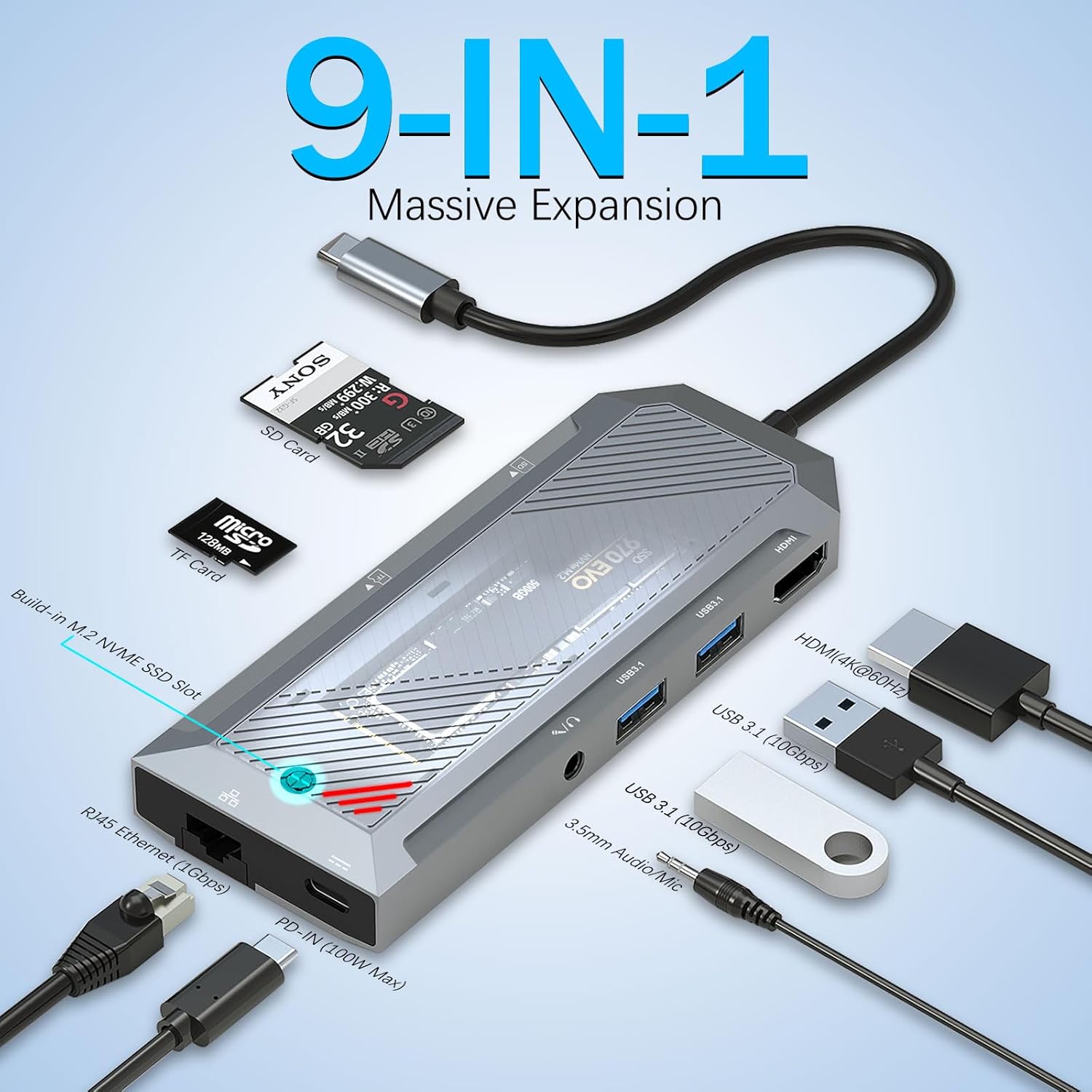 9-в-1 USB-C хъб със SSD корпус за M.2 NVMe 4K 60Hz HDMI сплитер е многофункционално разширително устройство, предназначено да подобри свързаността на лаптопи, таблети и други USB-C съвместими устройства. Той интегрира девет основни функции в едно компактно устройство, което позволява на потребителите да свързват множество периферни устройства, като същевременно поддържат високоскоростен трансфер на данни и надеждно захранване.