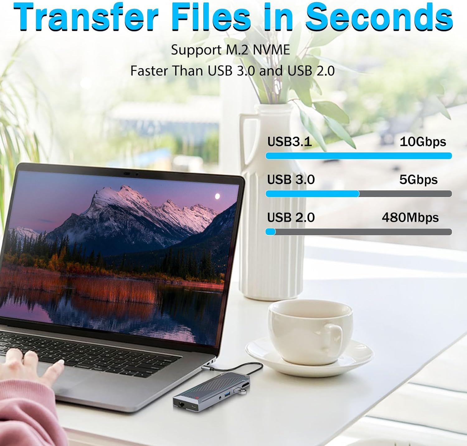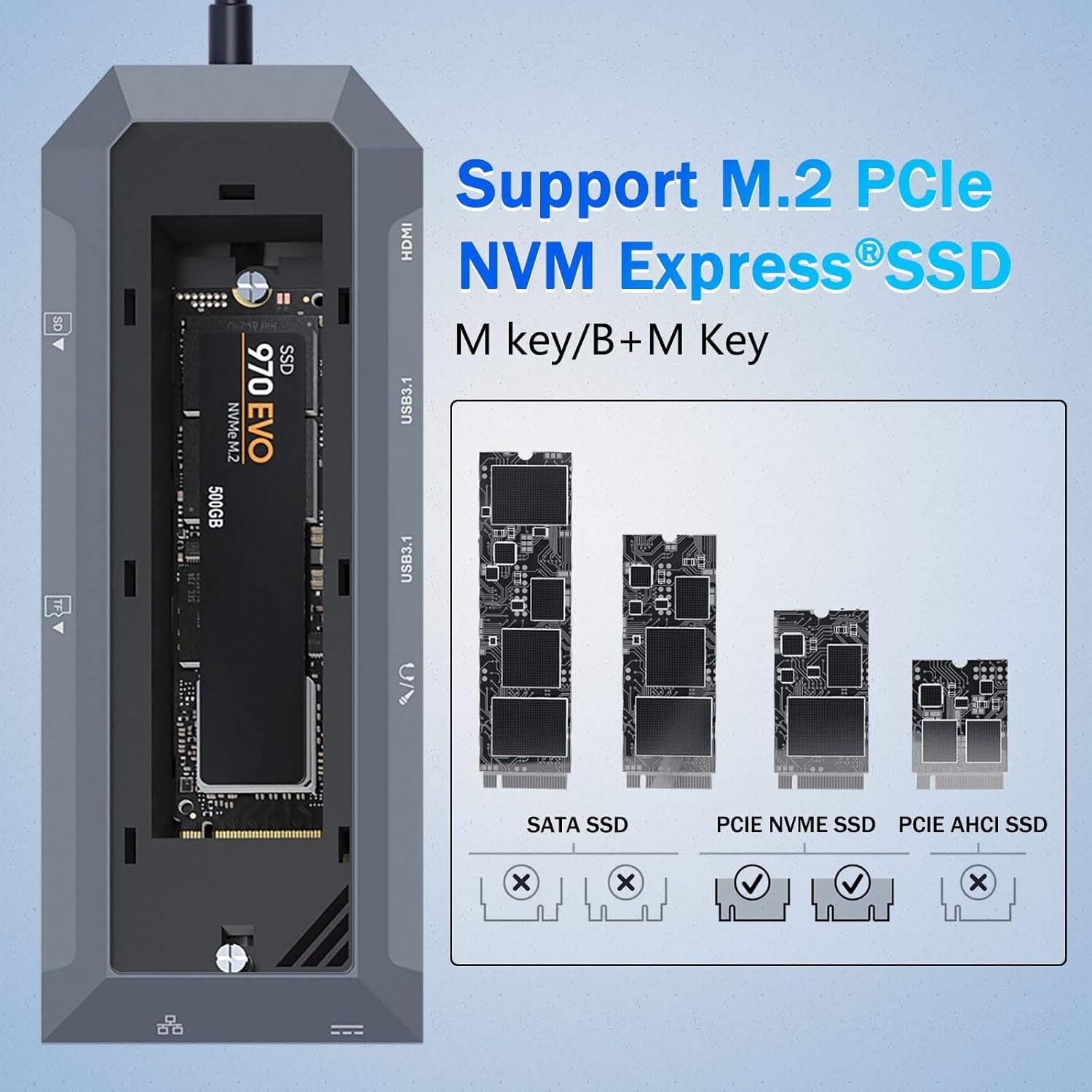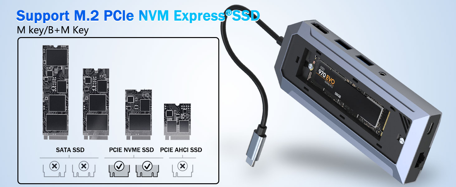 За разлика от традиционните USB хъбове, това устройство включва специален SSD корпус, който поддържа M.2 NVMe твърдотелни устройства. Тази функция позволява на потребителите да добавят високоскоростно хранилище директно към работното си пространство, без да изискват отделно външно устройство.