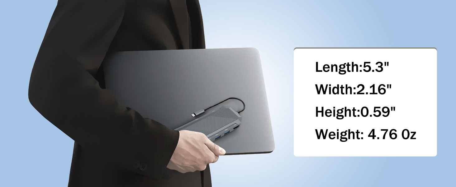 Въпреки мощната си функционалност, 9-в-1 USB-C хъб със SSD корпус за M.2 NVMe 4K 60Hz HDMI сплитер е проектиран да остане компактен и лек. Това го прави лесен за носене в чанти за лаптоп, раници или калъфи за пътуване.