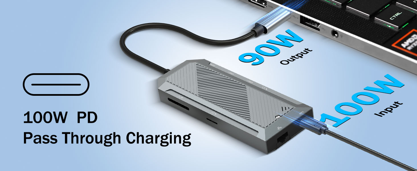 Поддръжката за захранване гарантира, че устройствата остават заредени, докато хъбът се използва. USB-C PD портът позволява захранването да преминава през хъба и към свързания лаптоп или таблет.