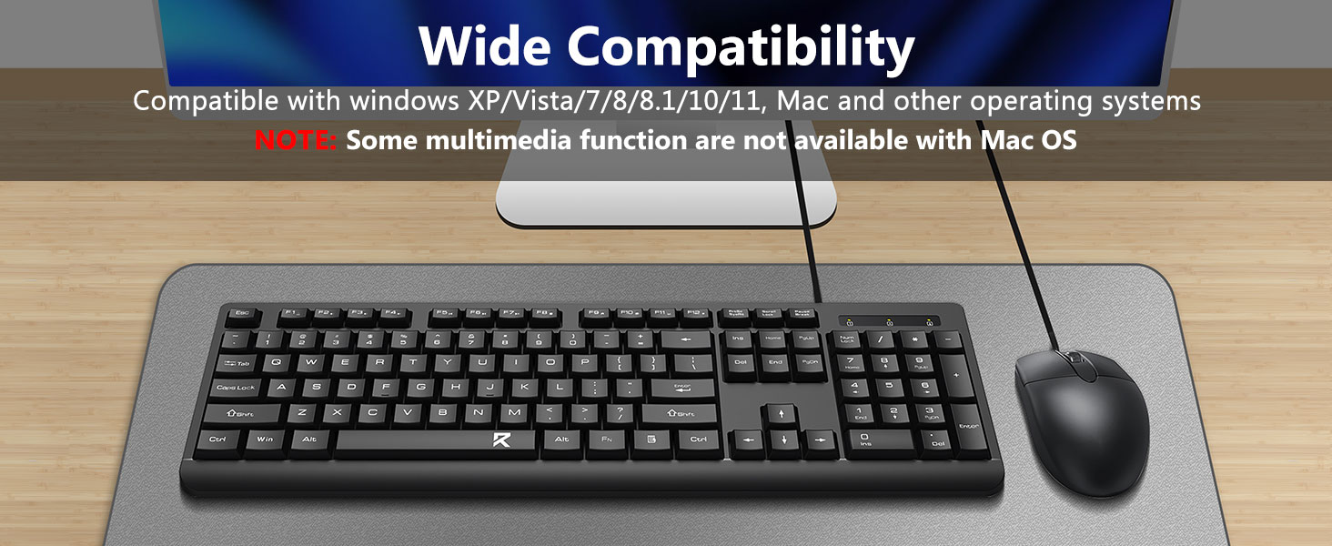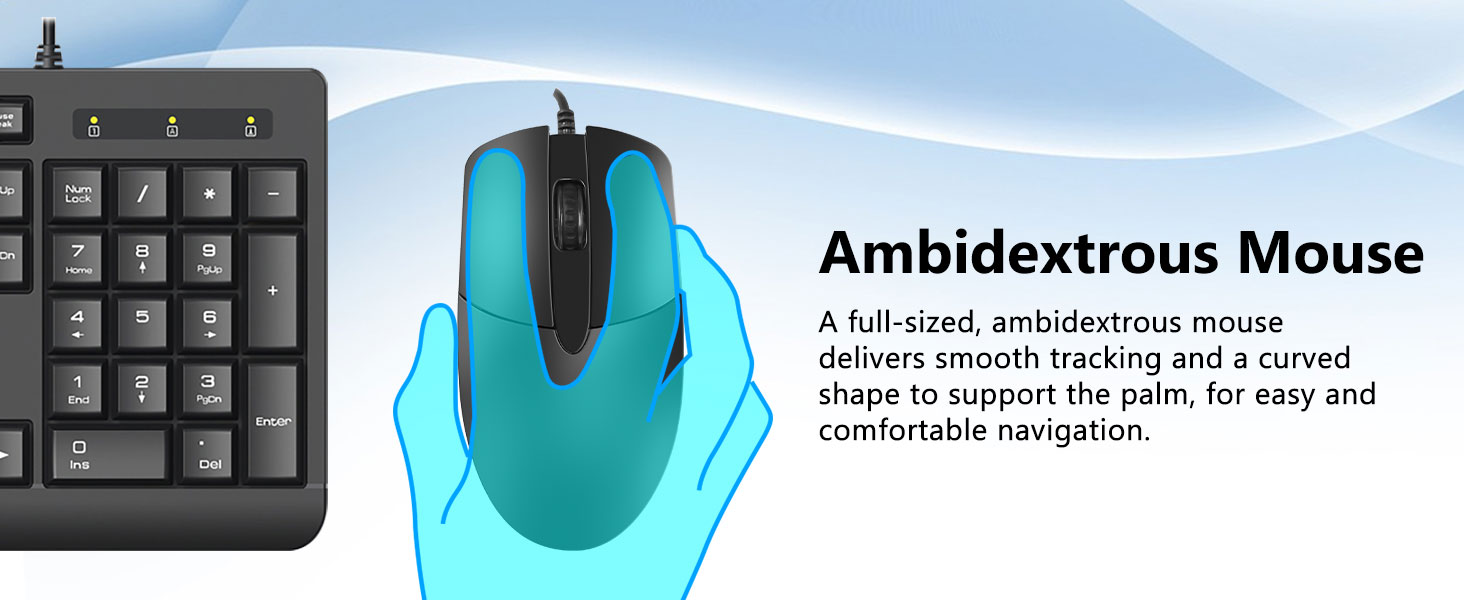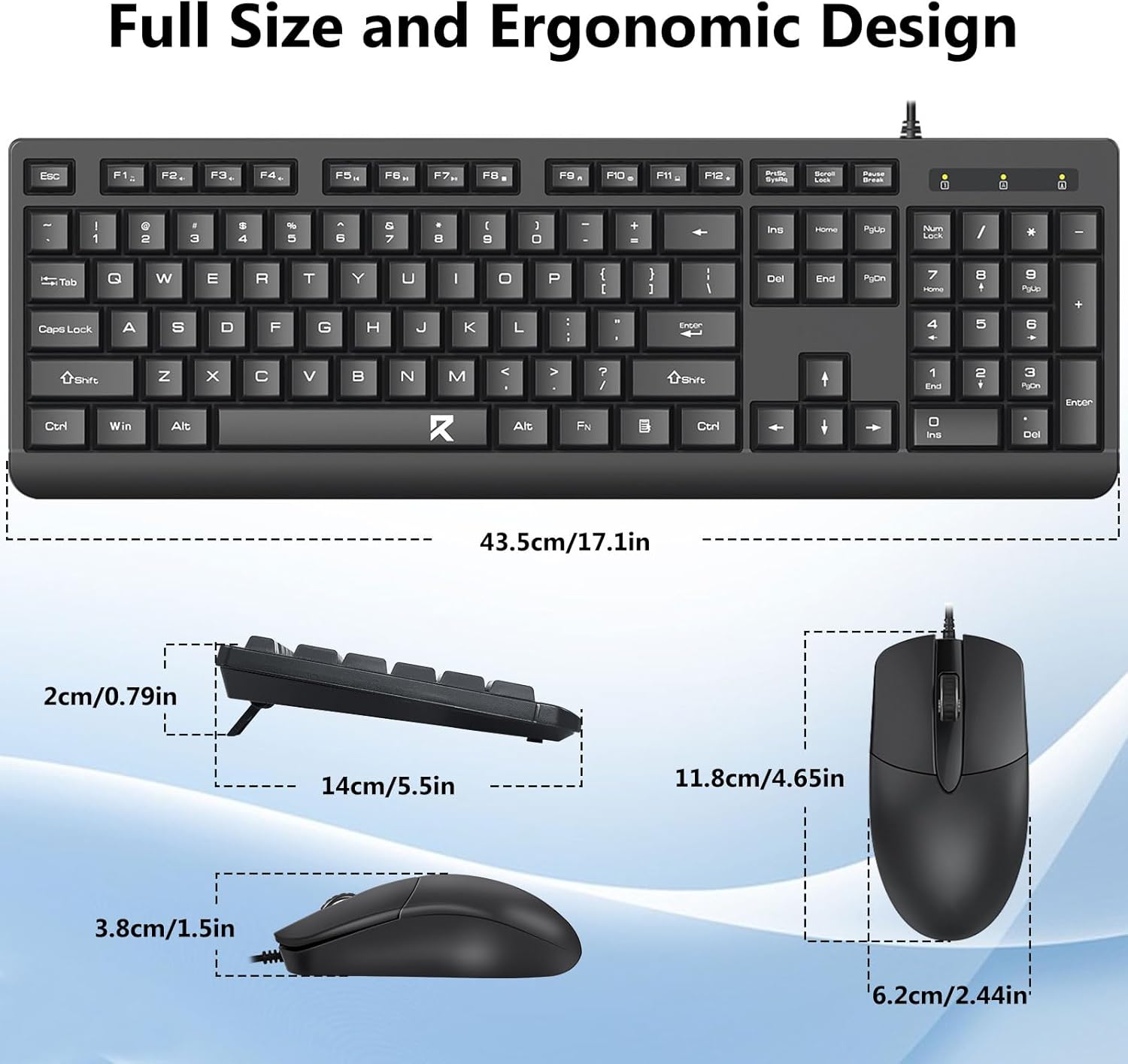 Подредбата на клавиатурата в пълен размер включва цифрова клавиатура, мултимедийни клавиши и удобно разстояние между клавишите. Придружаващата мишка е проектирана за точно проследяване и плавно движение на курсора по различни повърхности.