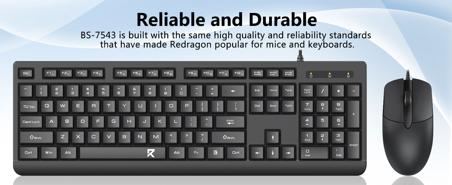 Черната комбинация от кабелна клавиатура и мишка BC7543 е проектирана с мисъл за издръжливост и комфорт. Клавиатурата разполага с тънка, но здрава рамка, която помага да се поддържа стабилност по време на писане. Неговият леко наклонен дизайн насърчава естествената позиция на китката, намалявайки напрежението по време на дълги сесии на писане.