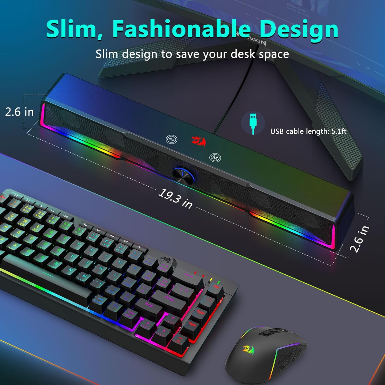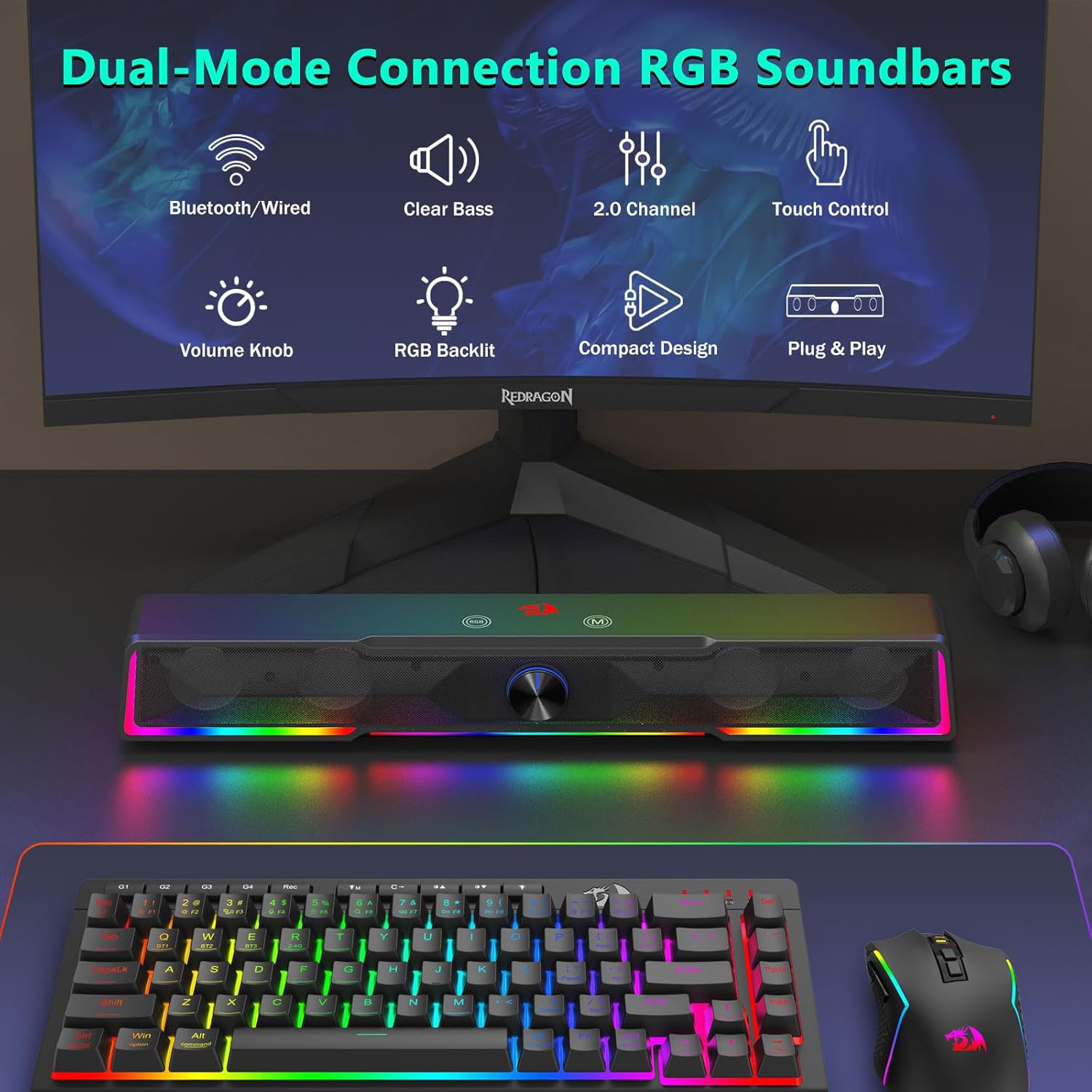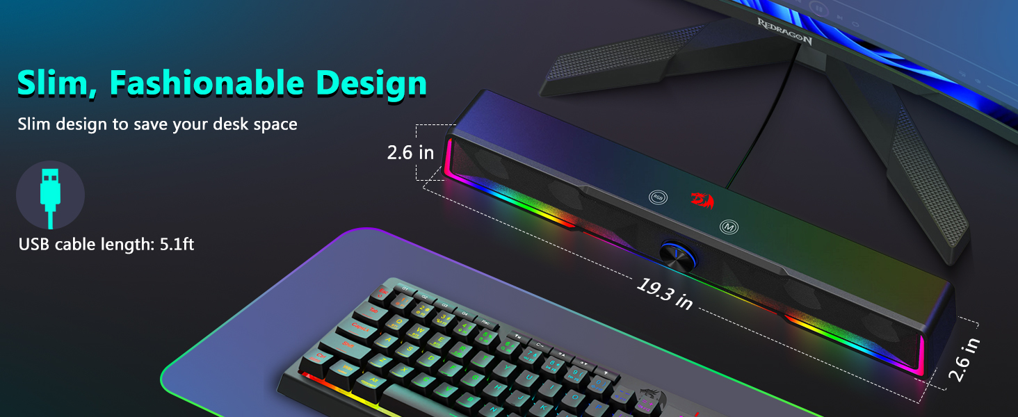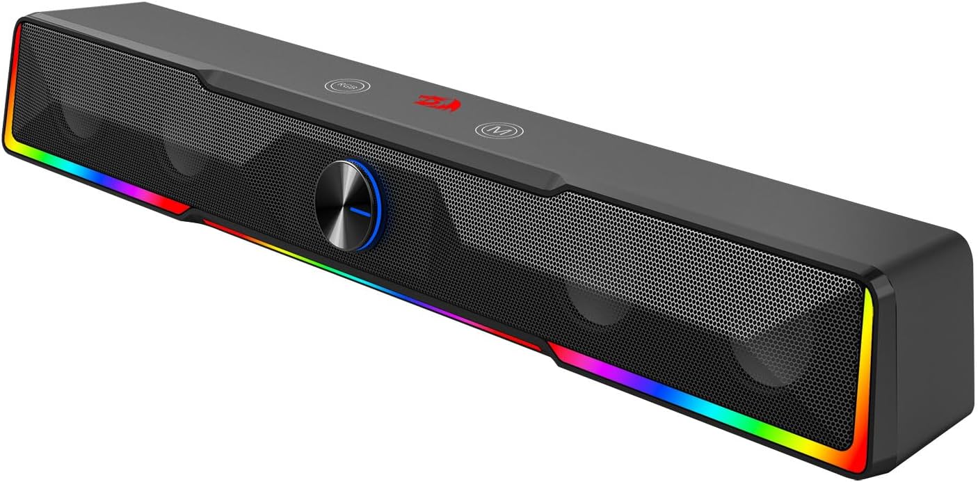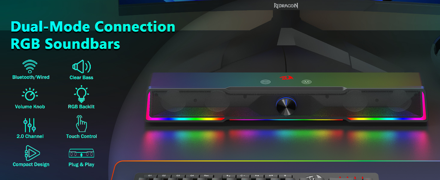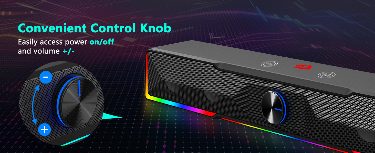 Спестяващ място дизайн на звуковата лента За разлика от традиционните високоговорители, които заемат големи площи от двете страни на монитора, черната GS516 Bluetooth/USB кабелна връзка Soundbar Volume Knob Компютърен високоговорител разполага с тънка структура на звуковата лента, която пасва удобно под повечето компютърни екрани. Този компактен дизайн помага за поддържането на чиста и организирана среда на бюрото, като същевременно предоставя богато и завладяващо аудио.