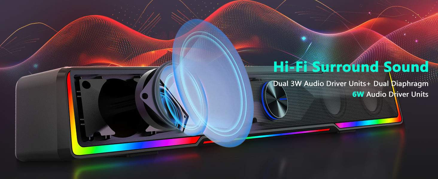 Висококачествен стерео звук Оборудван с мощни стерео драйвери, черният GS516 Bluetooth/USB кабелна връзка Soundbar Volume Knob Компютърен високоговорител осигурява балансиран звук с ясни вокали, детайлни средни честоти и подобрен бас. Високоговорителят е проектиран да произвежда завладяващ звук за множество типове съдържание, включително филми, игри, подкасти и музика.