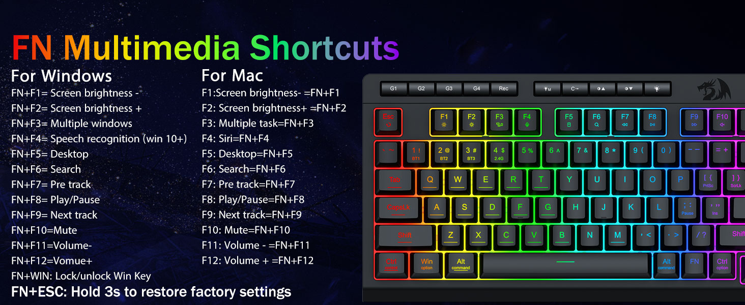 Персонализируеми макроси, управление без усилие- Програмирайте незабавно 4-те вградени макро клавиша (G1-G4) - не е необходим софтуер. Записвайте сложни комбинации за игри, преки пътища за продуктивност или медийни команди. Предефинирайте своя работен процес за секунди. Можете също да използвате софтуер за персонализиране на функции, създаване на макроси, регулиране на RGB светлини и задаване на преки пътища.