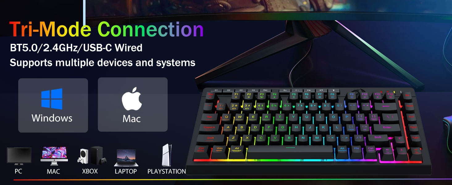 Гъвкавост в три режима и управление на множество устройства- Превключвайте безпроблемно между Bluetooth 5.0, 2.4GHz безжични или USB-C кабелни режими, свързвайки до 5 устройства едновременно (PC, Mac, таблети, телефони, PS/XBOX).
