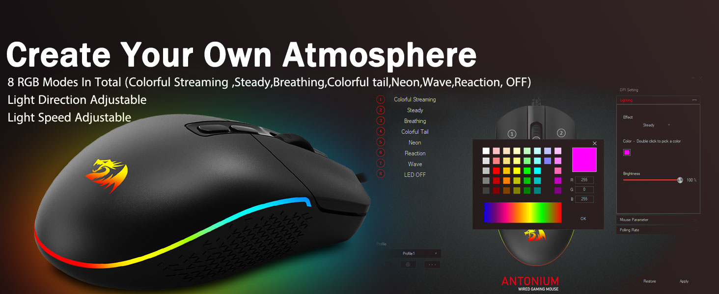 8 прилични режима на RGB подсветка- Включете подсветката и направете няколко убийства на бойното поле на играта. Развълнуваната динамична RGB подсветка никога няма да ви подведе, когато декорирате игралното си пространство, би било по-добре с други аксесоари на Redragon с включени светлини.