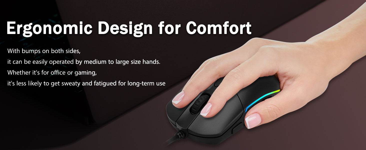 Комфортна дръжка- Ергономичните издатини от двете страни правят мишките за игри пасващи във всяка ръка. Осигурява дълготраен комфорт за играчите, без умора дори по време на дълги часове на интензивна игра. Няма да се плъзга при повдигане на игралната мишка или извършване на бързи и прецизни движения.
