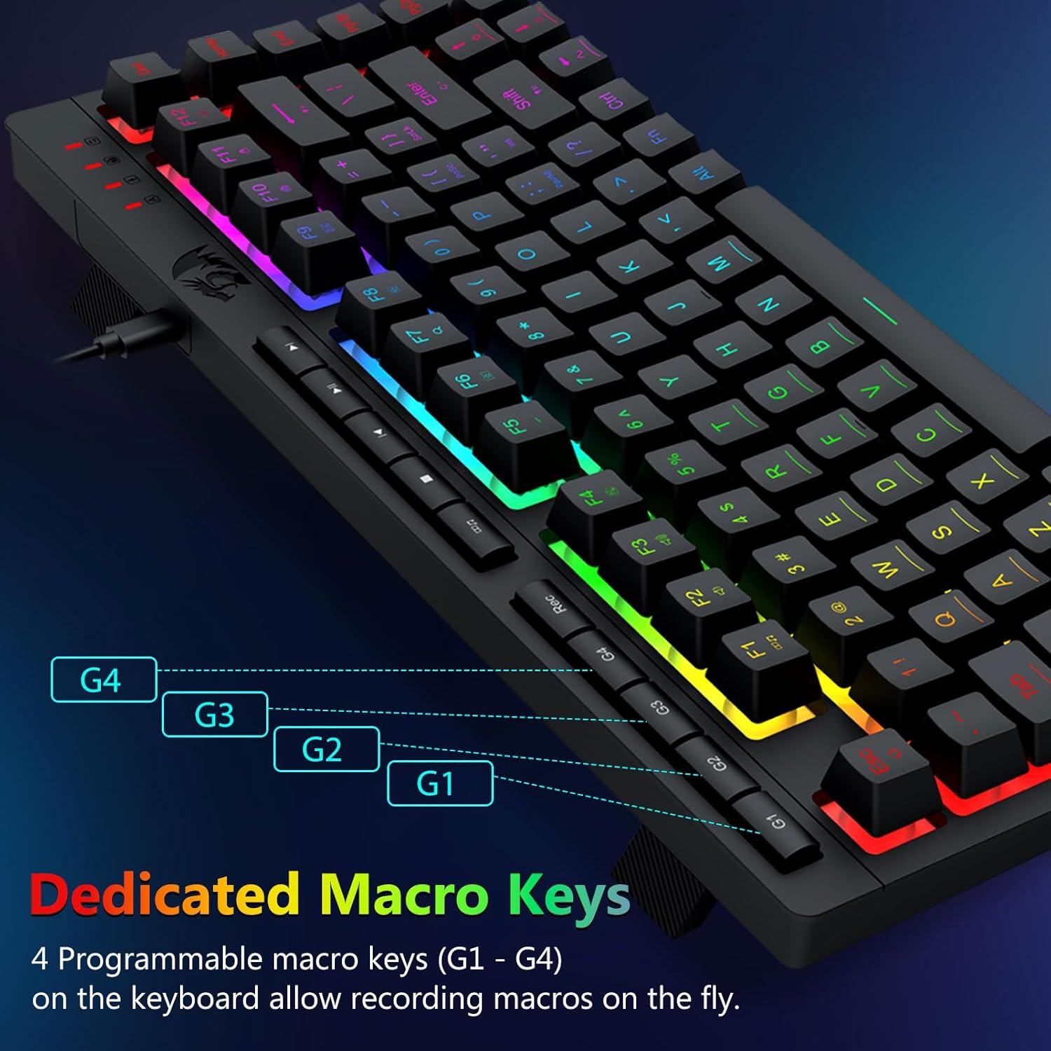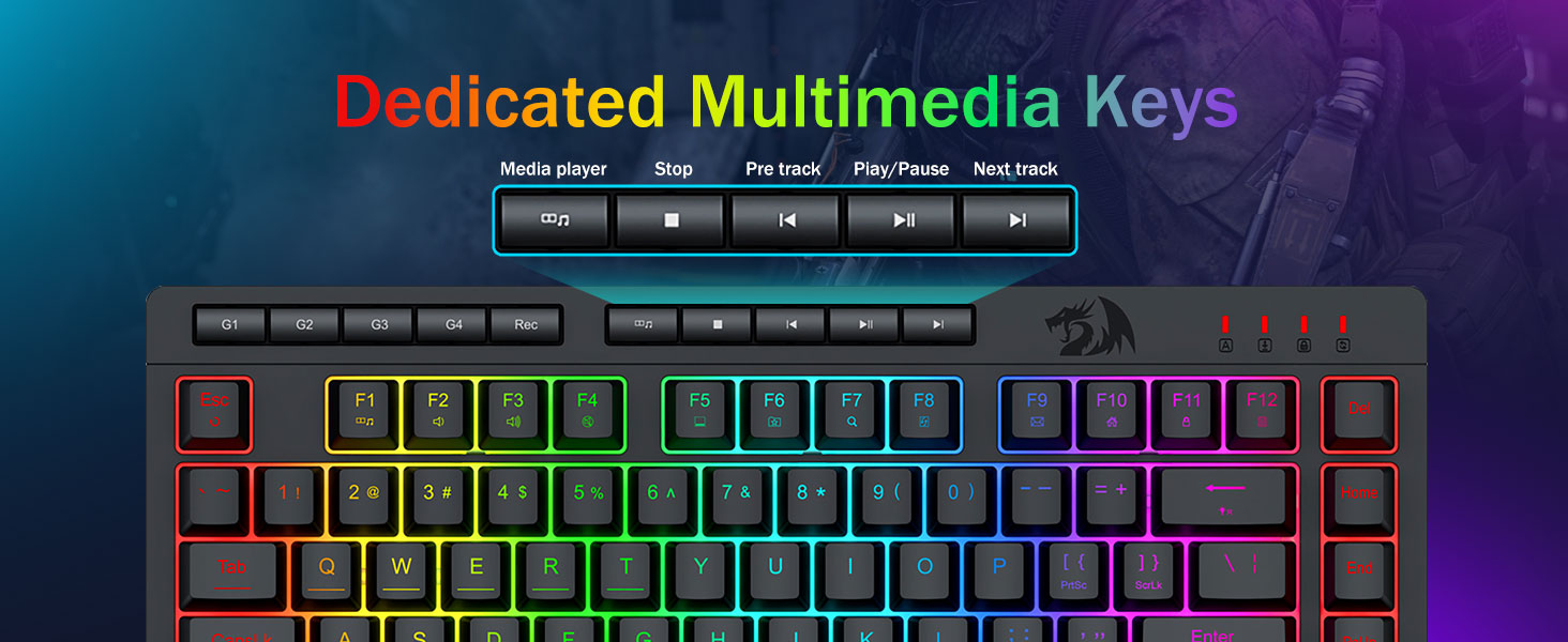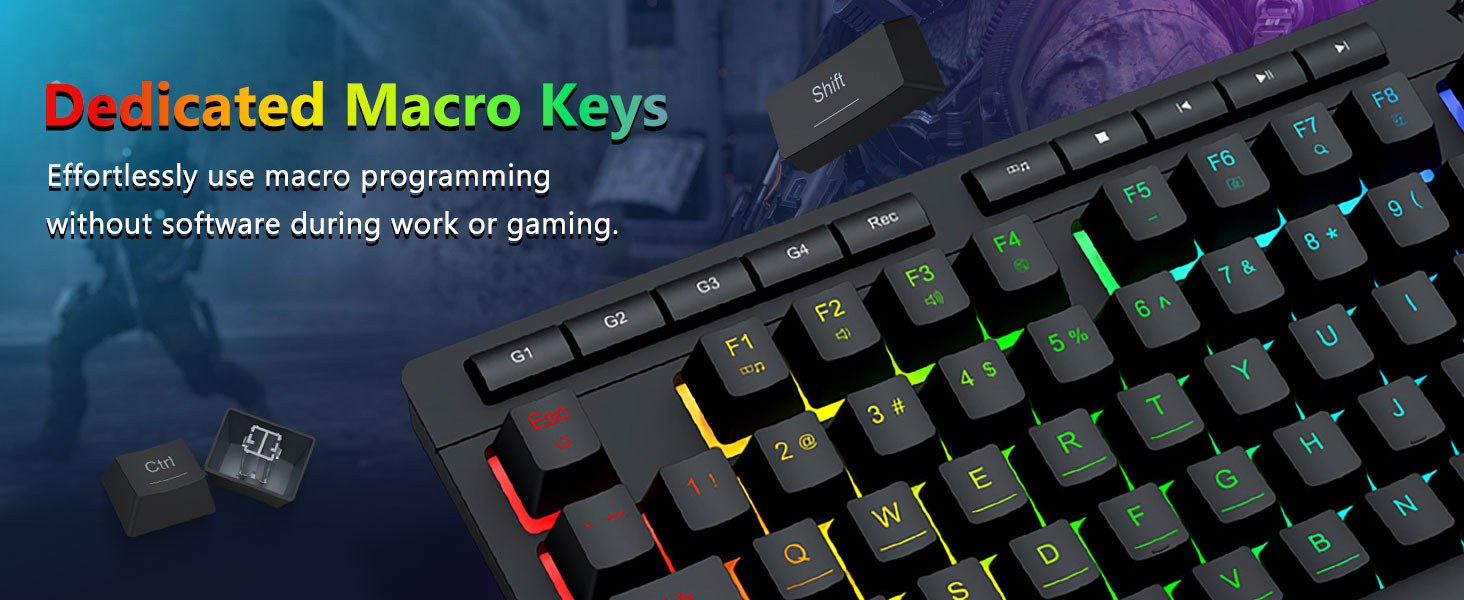 【Ефективно и удобно】Тази комбинация от клавиатура и мишка за игри е оборудвана с 4 вградени макро клавиша, 5 независими мултимедийни клавиша и 12 FN мултимедийни функционални клавиша, лесни и удобни за работа. Той не само подобрява ефективността, но също така прави процеса на игра по-удобен и по-бърз