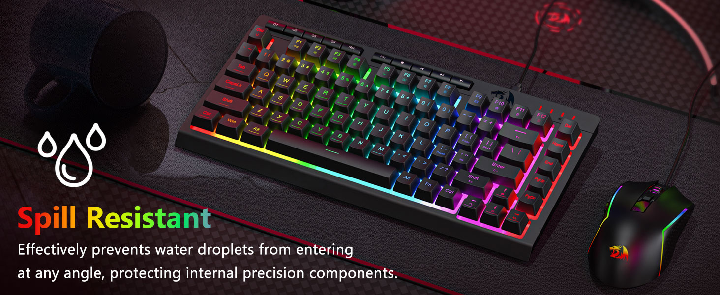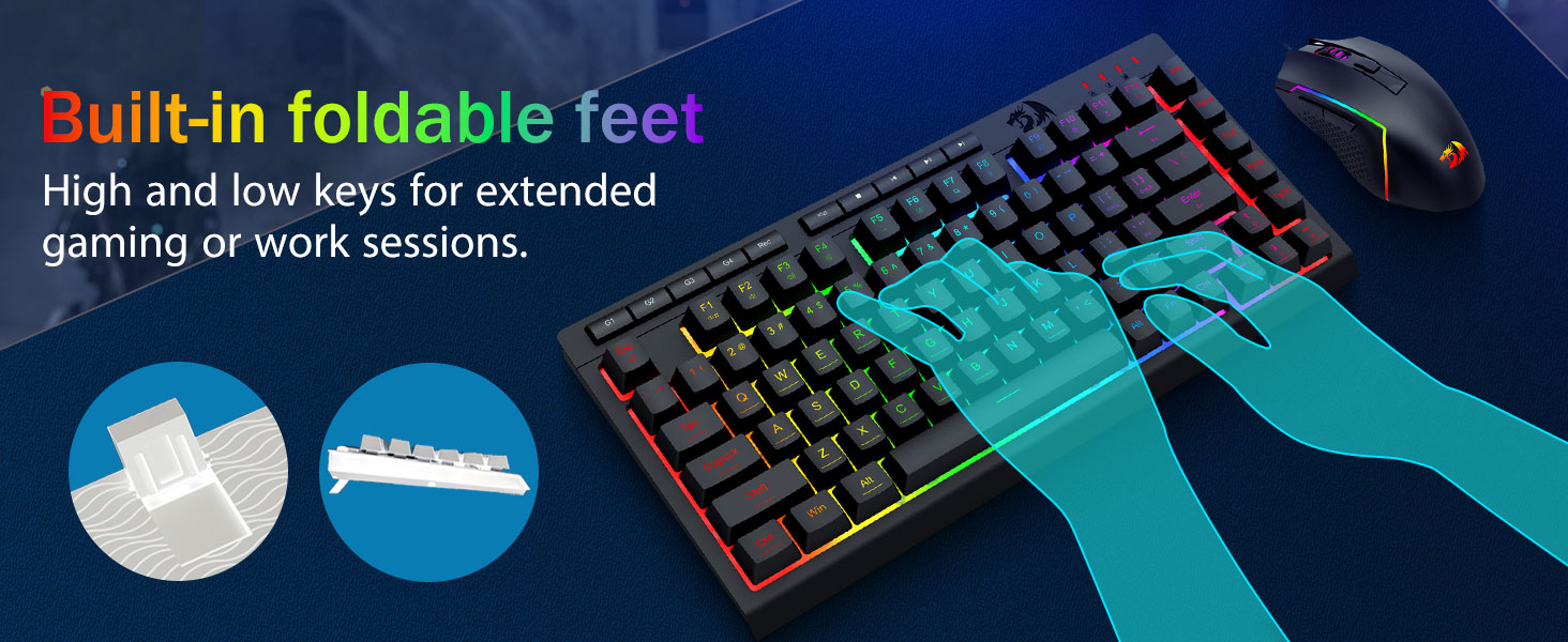 【RGB клавиатура и мишка за игри】Клавиатурата за игри има 8 RGB режима на осветление, от които да избирате, а мишката за игри има 8 светлинни ефекта, между които да превключвате, а клавиатурата може да се регулира за 4 нива на скорост и яркост, за да отговарят на вашите предпочитания. Капачките на клавишите предлагат ясна равномерно фоново осветление. Независимо дали комплектът е с една светлина, променящи се светлинни ефекти или изобщо няма светлина, игралната клавиатура и мишка Redragon ще отговорят на вашите нужди!
