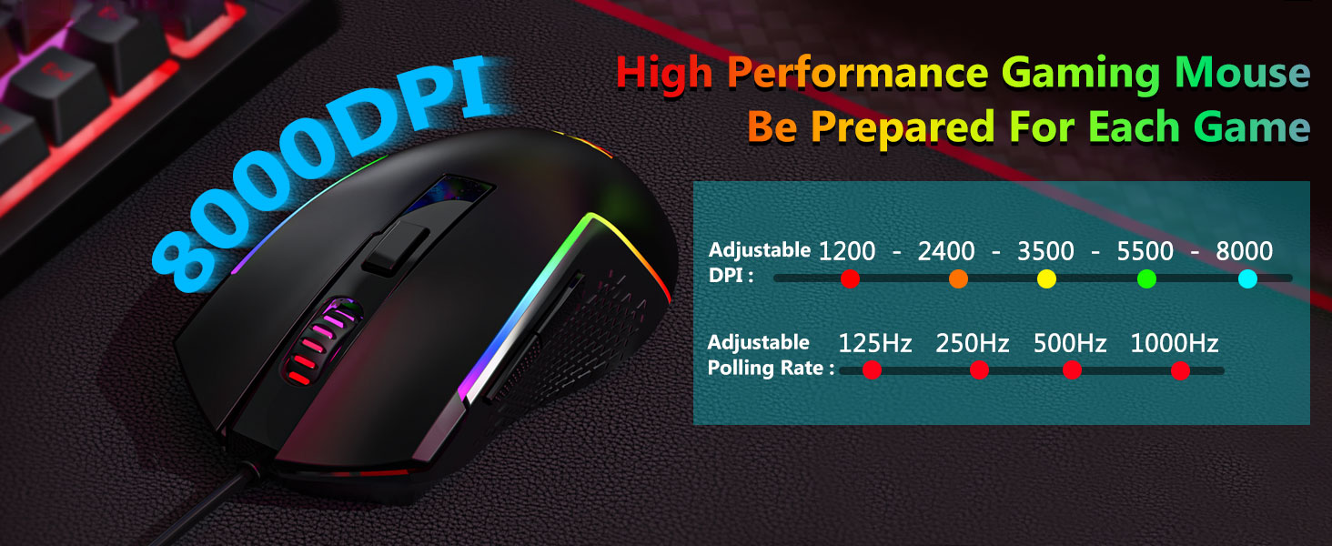 【Професионална мишка за игри】Можете да регулирате DPI от 1200 до 8000 чрез бутона DPI или от 100 до 8000 чрез софтуерния драйвер, за да посрещнете лесно различните си нужди при игри или работа. Общо 7 бутона, от които 6 са програмируеми. Високопрецизният сензор осигурява прецизна точност, докато микропревключвателите Gaming Grade гарантират дълготрайност, по-голяма издръжливост и изключителна бързина на реакция, което ви дава още по-голямо предимство пред конкуренцията. (Софтуерът също поддържа регулиране на скоростта на запитване на мишката до 1000Hz)