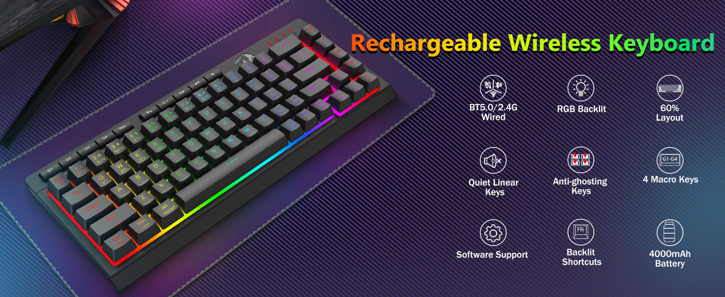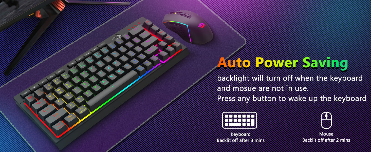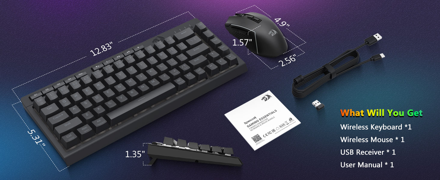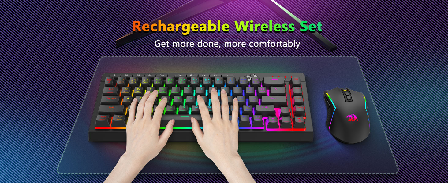 Черната комбинация от безжична игрална клавиатура и мишка S157 от Redragon, експертно изработена от професионалния производител Chuangquan, е проектирана да издигне вашата игрална станция както в производителност, така и в стил. Клавиатурата предлага задоволителна тактилна реакция, идеална както за интензивни игрови маратони, така и за продължителни сесии за писане, докато мишката гарантира изключителна точност с регулируемите DPI настройки за превъзходен контрол по време на игра. И двата компонента са оборудвани със завладяваща RGB подсветка, която ви позволява да персонализирате атмосферата на вашата настройка със спектър от цветове и динамични ефекти.