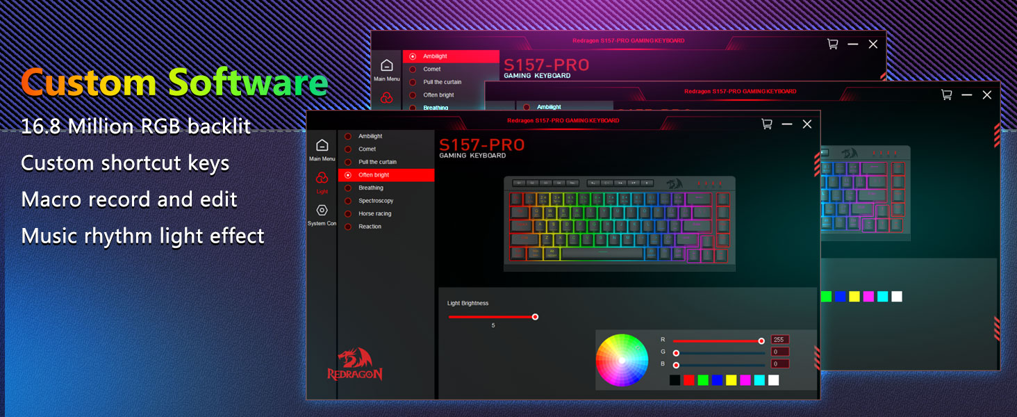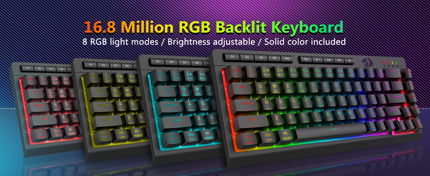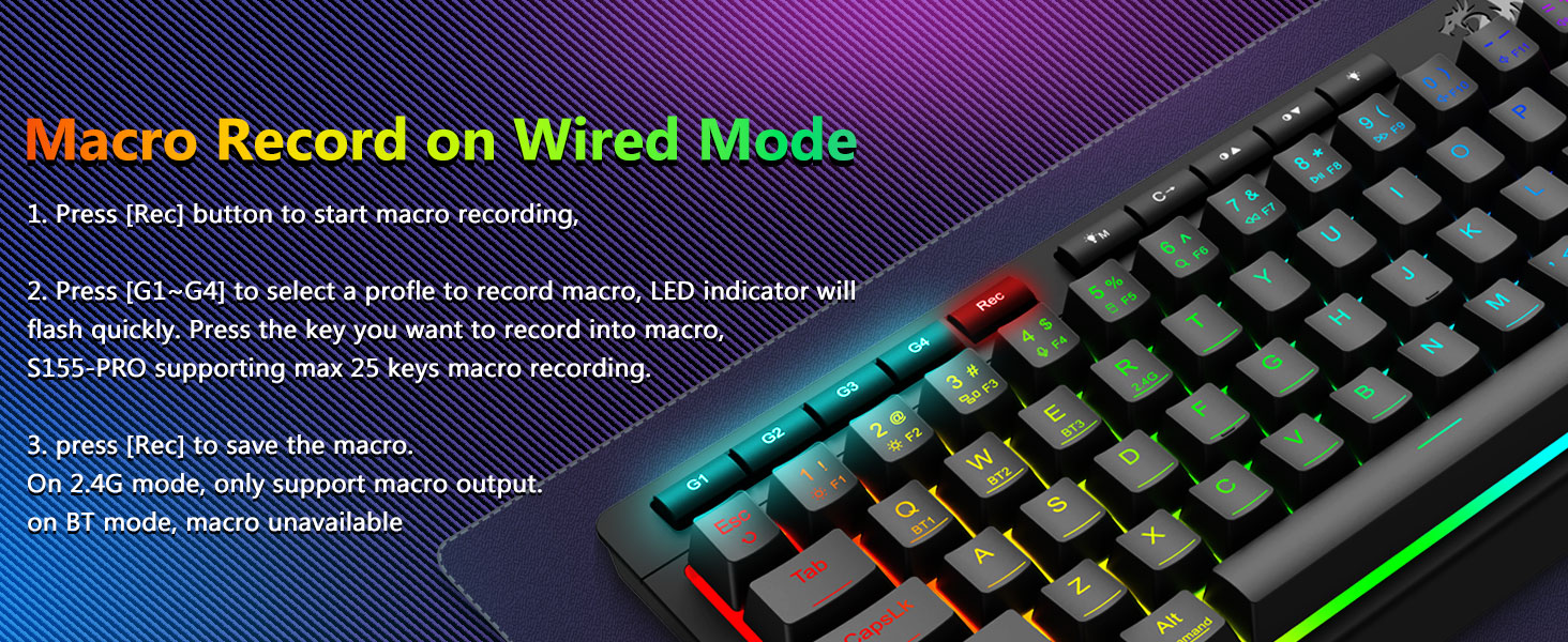 Персонализируеми макроси, специални контроли с подсветка- Програмирайте незабавно 4-те вградени макро клавиша (G1-G4) - не е необходим софтуер. Записвайте сложни комбинации за игри, преки пътища за продуктивност или медийни команди. Предефинирайте своя работен процес за секунди. Можете също да използвате софтуер за персонализиране на функции, създаване на макроси, регулиране на RGB светлини и задаване на преки пътища. Снабден с клавиши против призраци (клавиши с долна черта), които позволяват на 26 клавиша да работят едновременно за бързи и точни отговори на играта, както сте планирали. Бутони за бърз достъп за яркост, режим на осветление и режим на игра за бързо регулиране на яркостта, профили на осветление и активиране на режим на игра с едно натискане на бутон.