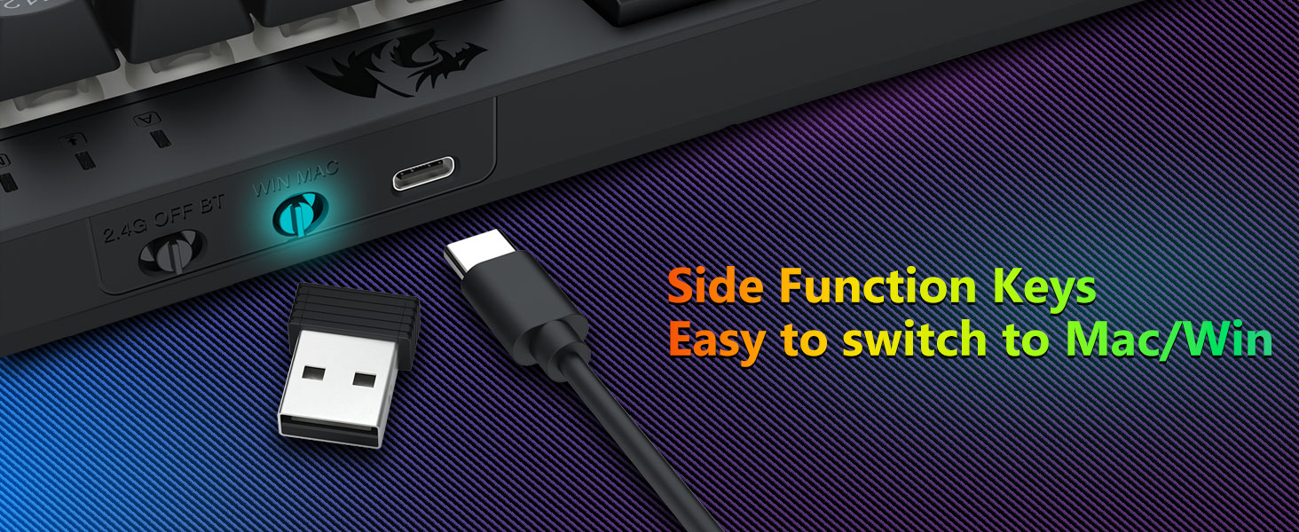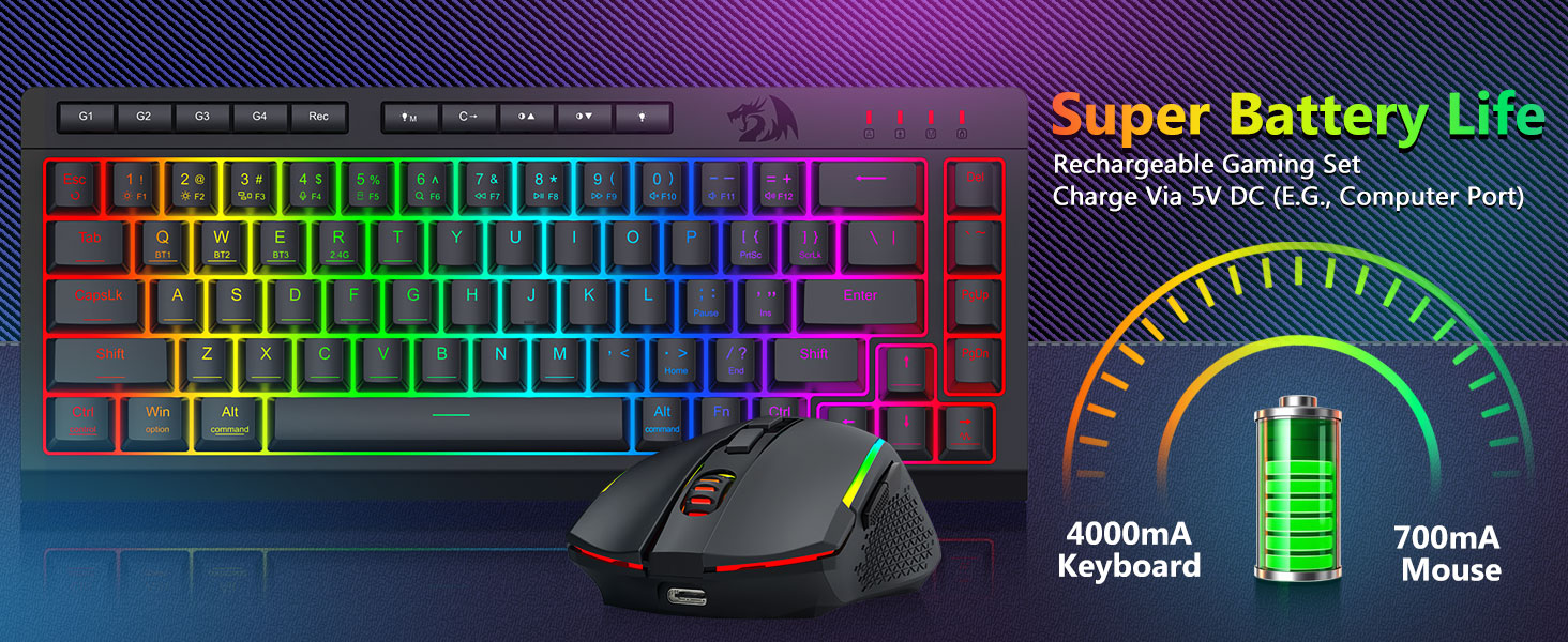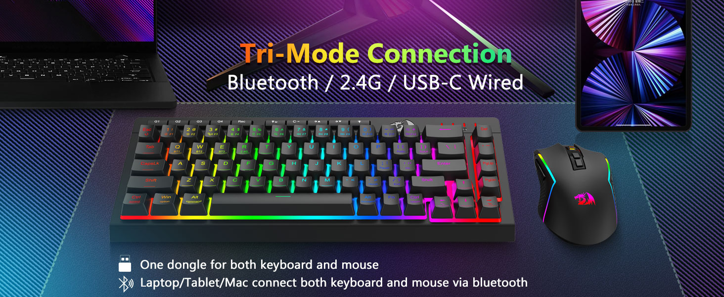 Универсална клавиатура и мишка с три режима- Превключвайте безпроблемно между Bluetooth 5.0, 2.4GHz безжични или USB-C кабелни режими, свързвайки се с различни устройства (PC, Mac, таблети, телефони, PS/XBOX). Безпроблемно превключвайте устройства чрез клавишни комбинации или страничен бутон—идеално за хибридни настройки за работа/игри. Останете захранвани в продължение на седмици с клавиатурата с батерия от 4000 mAh и мишката с батерия от 700 mAh (30+ дни в режим на готовност, 50 часа RGB време на работа).