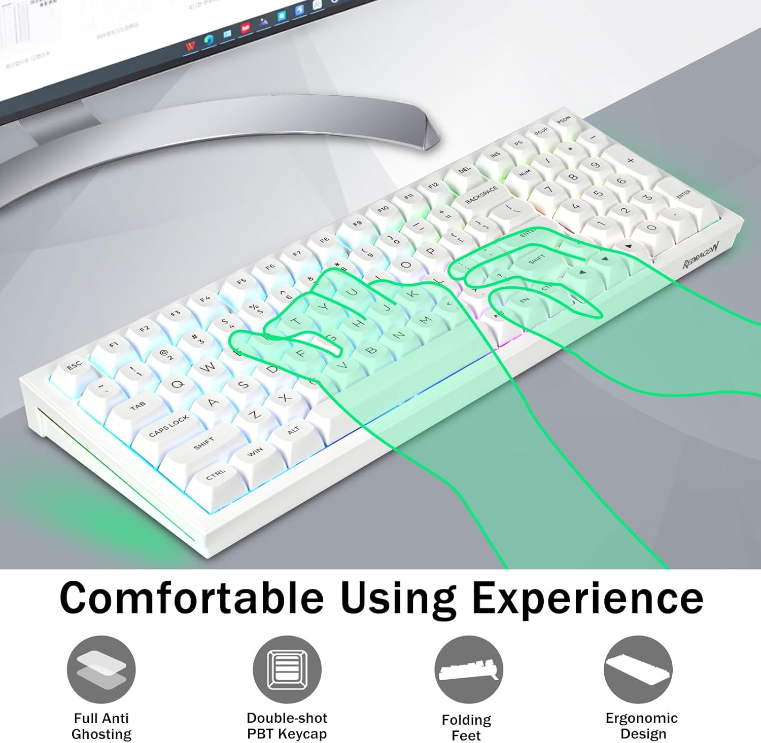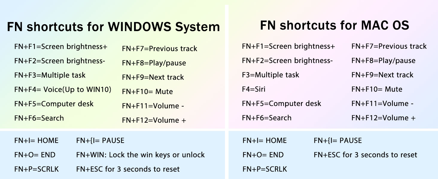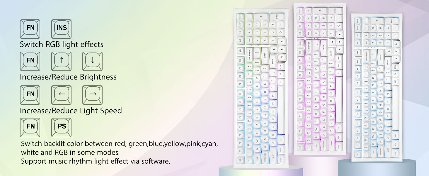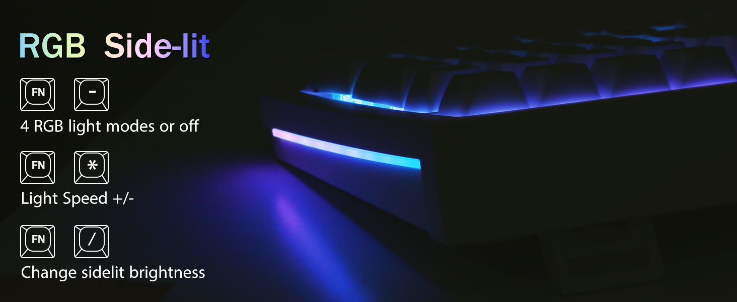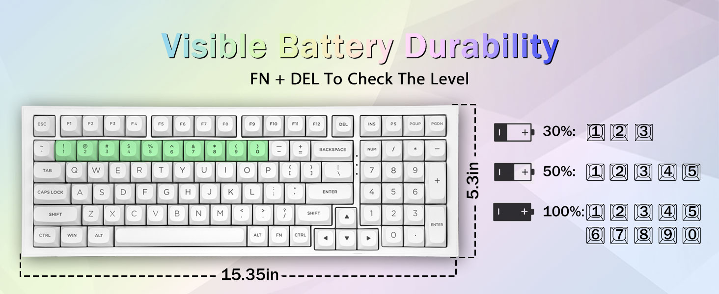 PBT ключове и 4000mAh батерия:Компактната клавиатура с 99 клавиша и 96% оформление може да спести повече място на работния плот, като същевременно запази необходимите клавиши със стрелки и областта с числа за игри и работа. Акумулаторната клавиатура има вградена батерия с голям капацитет от 4000 mAh, за да осигури повече мощност и по-дълъг живот на батерията. Двойни PBT клавишни капачки, направени от двуцветен материал, формован един в друг, карат символите на клавишните капачки да поддържат жизненост и наситеност, ясни и да не избледняват.