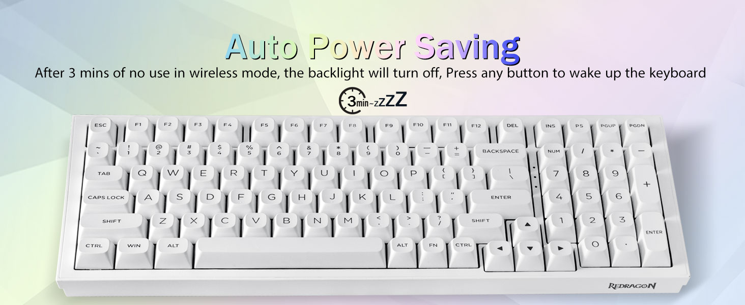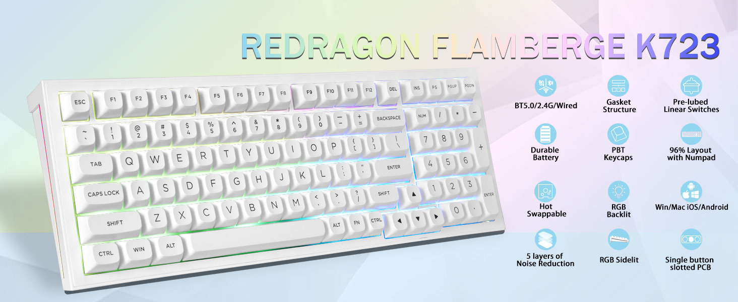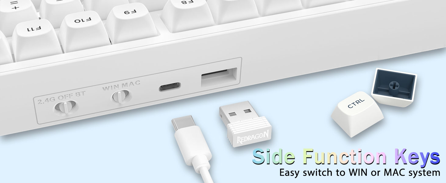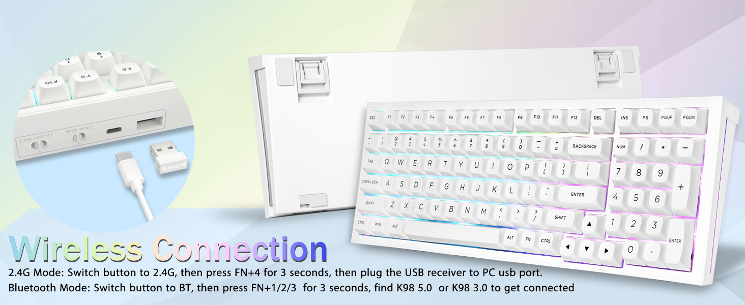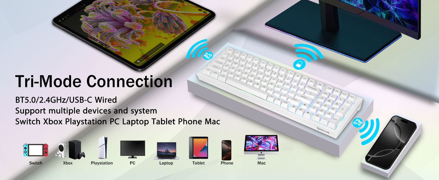Връзка с множество устройства:Безжичната механична клавиатура Redragon K723 осигурява три метода на свързване, включително BT5.0, 2.4GHz безжичен режим и USB кабелен режим. Може да се свърже с до пет устройства едновременно и да превключва между тях лесно чрез FN и клавишни комбинации. Няма ограничения за вашата връзка с клавиатура, за да посрещнете нуждите на работа, игри и учене.