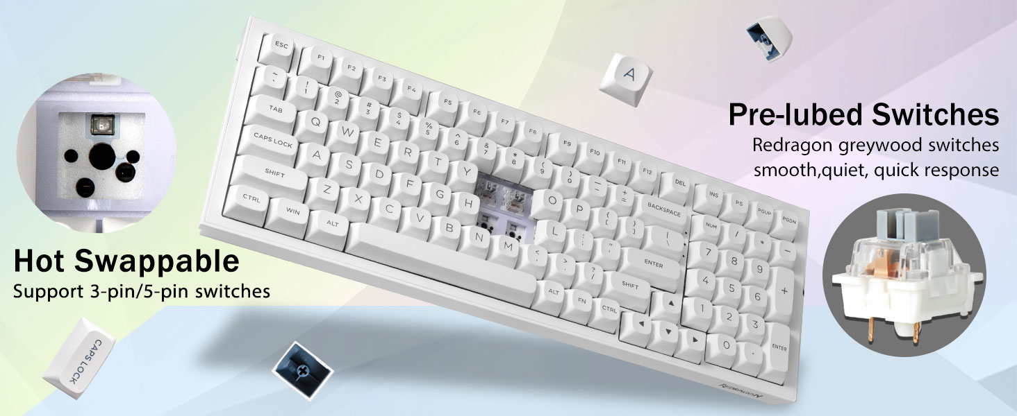 Персонализирана клавиатура с възможност за гореща смяна:Превключвателите и капачките на клавишите могат да се сменят свободно (капачката/приспособлението за издърпване на превключвателя са включени в пакета). Тази адаптивна клавиатура с печатна платка с гореща смяна позволява на потребителите лесно да сменят 3 пинови/5 пинови превключватели без проблем със запояване. K723 механични клавиатури, оборудвани с предварително смазани линейни превключватели, осигуряват гладко усещане при писане и приятен звук при писане, осигуряват бърз отговор за вълнуваща игра