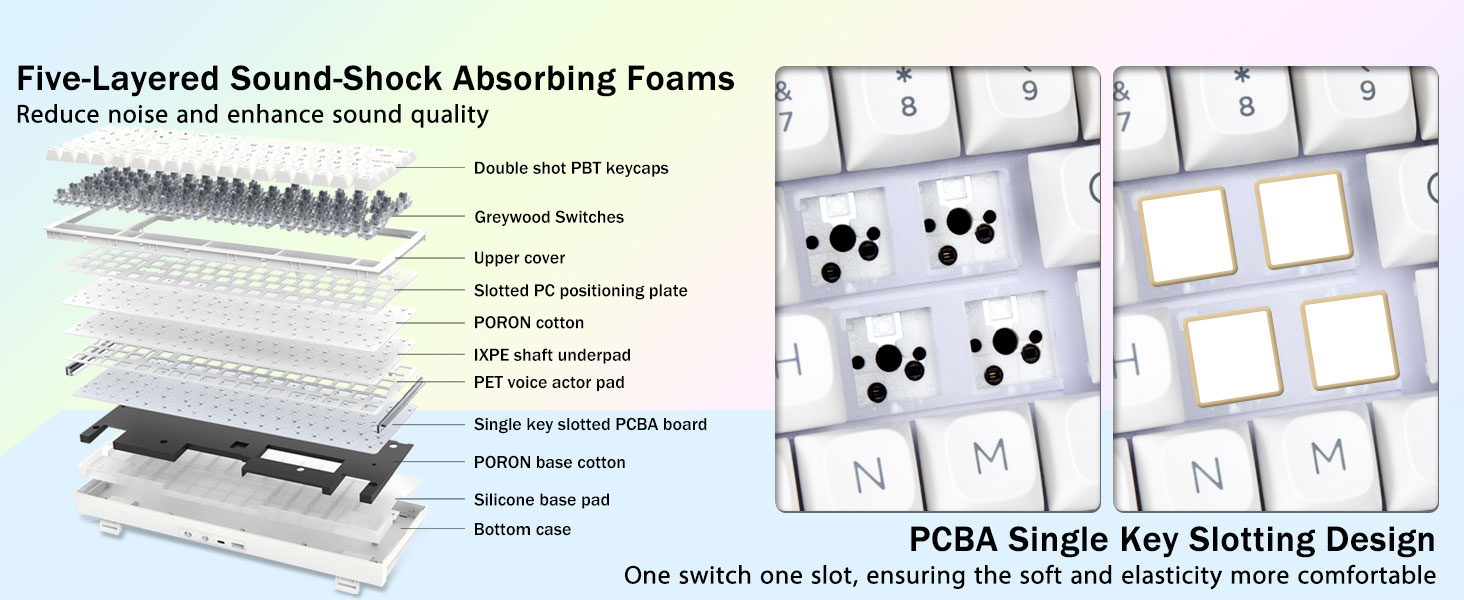 Структура на уплътнението и печатни платки с един ключ:Тази компютърна клавиатура разполага със структура на уплътнение, разширена интегрирана силиконова подложка и прорез за единичен клавиш на PCB, оптимизира по-добре устойчивостта и стабилността, правейки ръката да се чувства по-мека и еластична. Пет слоя шумозаглушител за пълнене запълва празнината между печатната платка, позициониращата плоча и вала, като ефективно противодейства на шума от кухината на вала, удрящ позициониращата плоча, и осигурява солидно усещане.