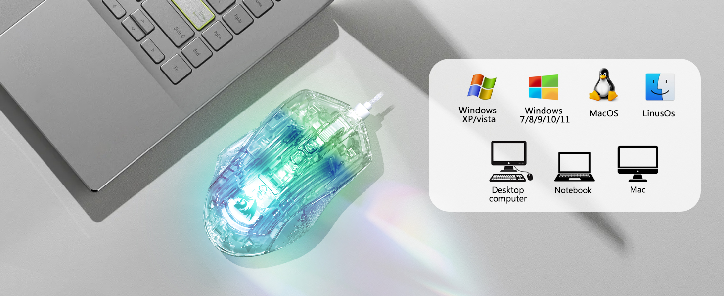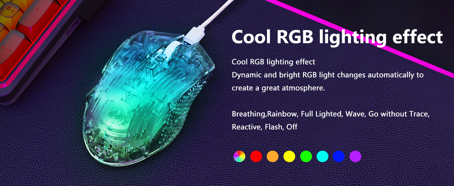 Мишката включва осем RGB светлинни ефекта, които подобряват визуалната привлекателност, без да засягат производителността. Потребителите могат да превключват между режимите на осветление, за да съответстват на техните настройки или лични предпочитания.
