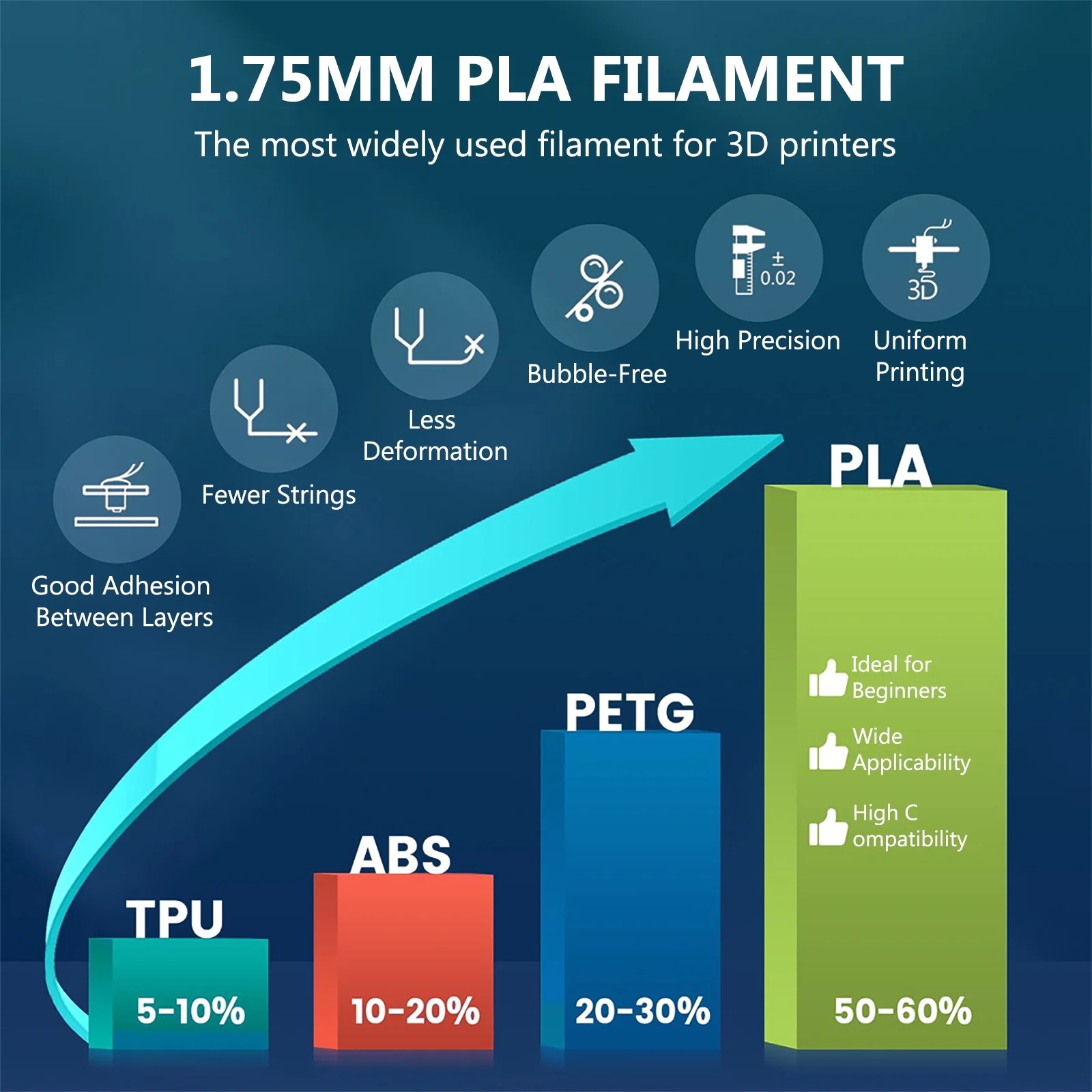 PLA филаментът се топи при относително ниски температури и не изисква сложни конфигурации на принтера, което го прави подходящ както за начинаещи, така и за опитни потребители.